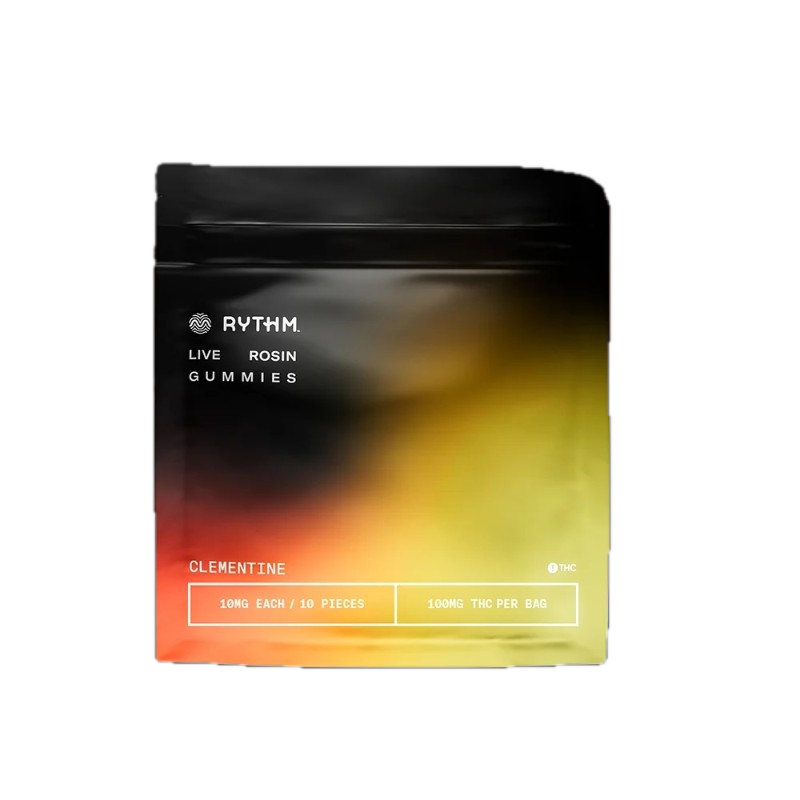 Clementine Afternoon Delight gummies (10mg THC per gummy, 100mg total per 10-pack) by RYTHM are vegan-friendly, pectin-based edibles crafted using solventless live rosin (extracted with ice, water, heat, and pressure). They are designed to offer a "melt-in-mouth" texture, featuring a bright, citrusy flavor profile with notes of floral and earthy diesel, derived from the Afternoon Delight #4 strain (a cross of GMO x Trophy Wife).
